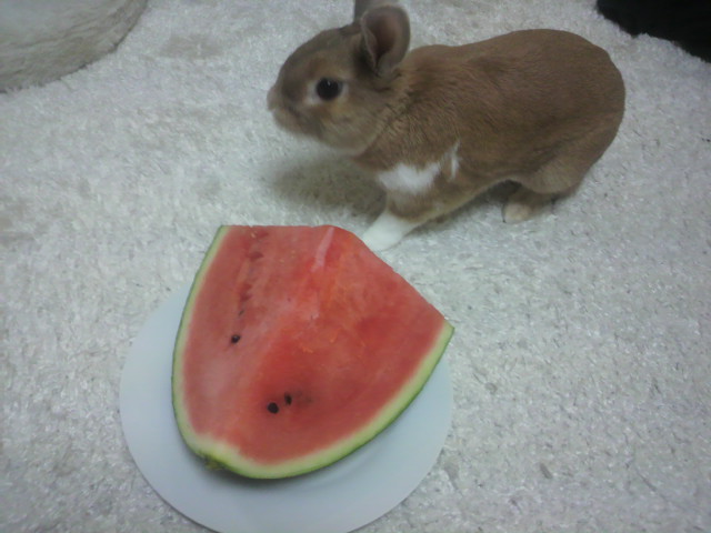 いいおばちゃんですね。すいかをくれるなんて。うさぎ素晴らしくかわいいですね。動物好きな人に悪い人はいません。きっとDAIさんは心のやさしい人だと思います。