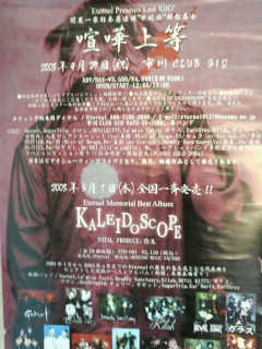 久し振りにアホ丸出し飲み会になった(笑) ローディー君たちも沢山集まってくれて楽しかった。 彼は何でも出来る逸材だと俺は思う。 そしてもう詳細でてたけどアップするの忘れてた。 4/27に目黒鹿鳴館でEternalレーベル1日復活ライブする。 当時は飛びぬけて売れてるバンドはいなかったけど、個性派の バンドも多く血の気の多い奴が沢山いた。 警察沙汰になることが多かったけど楽しかった。 う~んあの当時の事は一生の思い出である。 27日(日)は15時オープンで何が起こるか分からない。 ソールドアウト設定してないせいか現時点でライブ会場に 入りきらない数らしいので、来る人は生死覚悟で来たほうが良い と思う。 写真は昔のレーベル解散ライブポスター 喧嘩上等 PR |